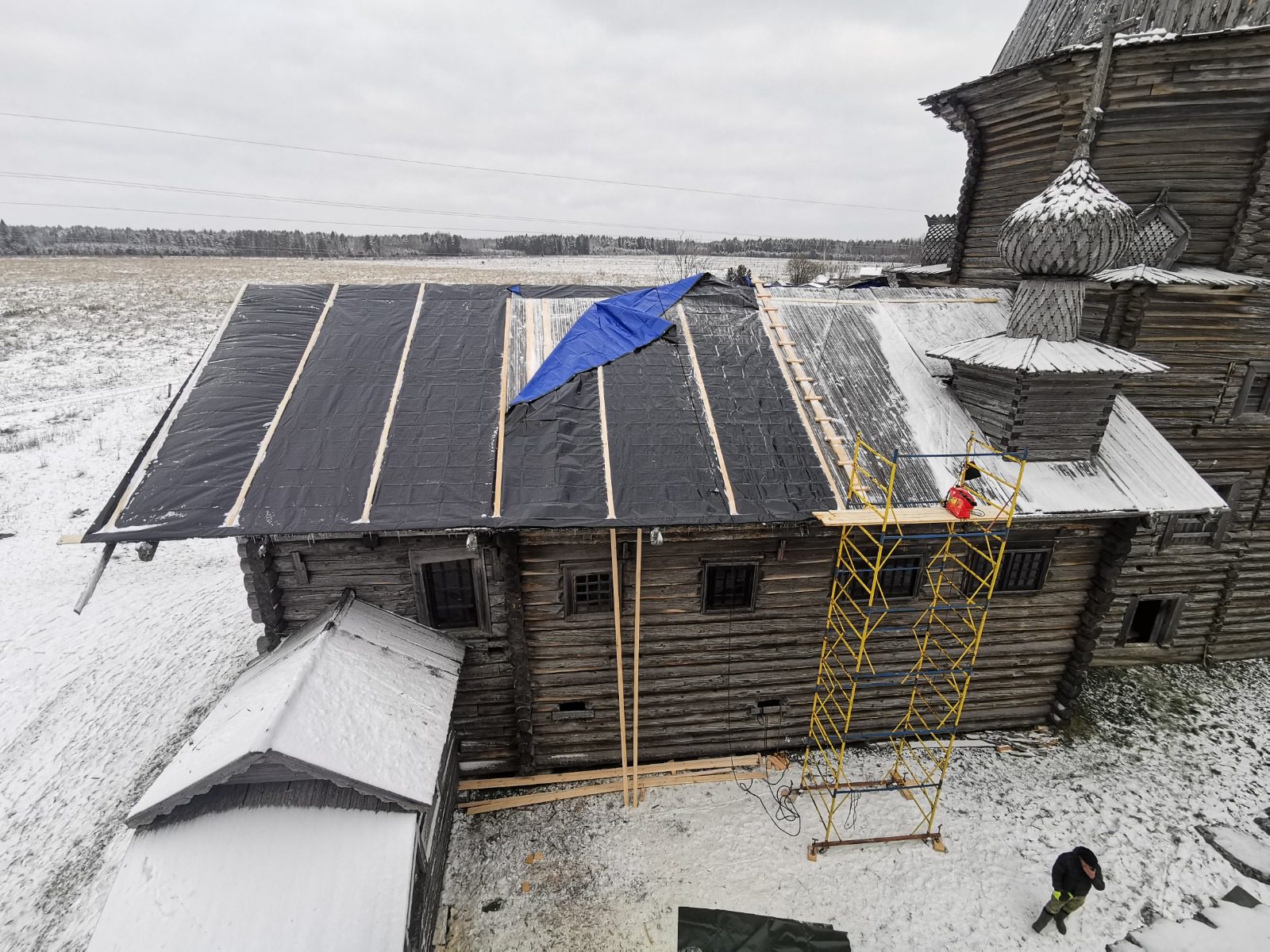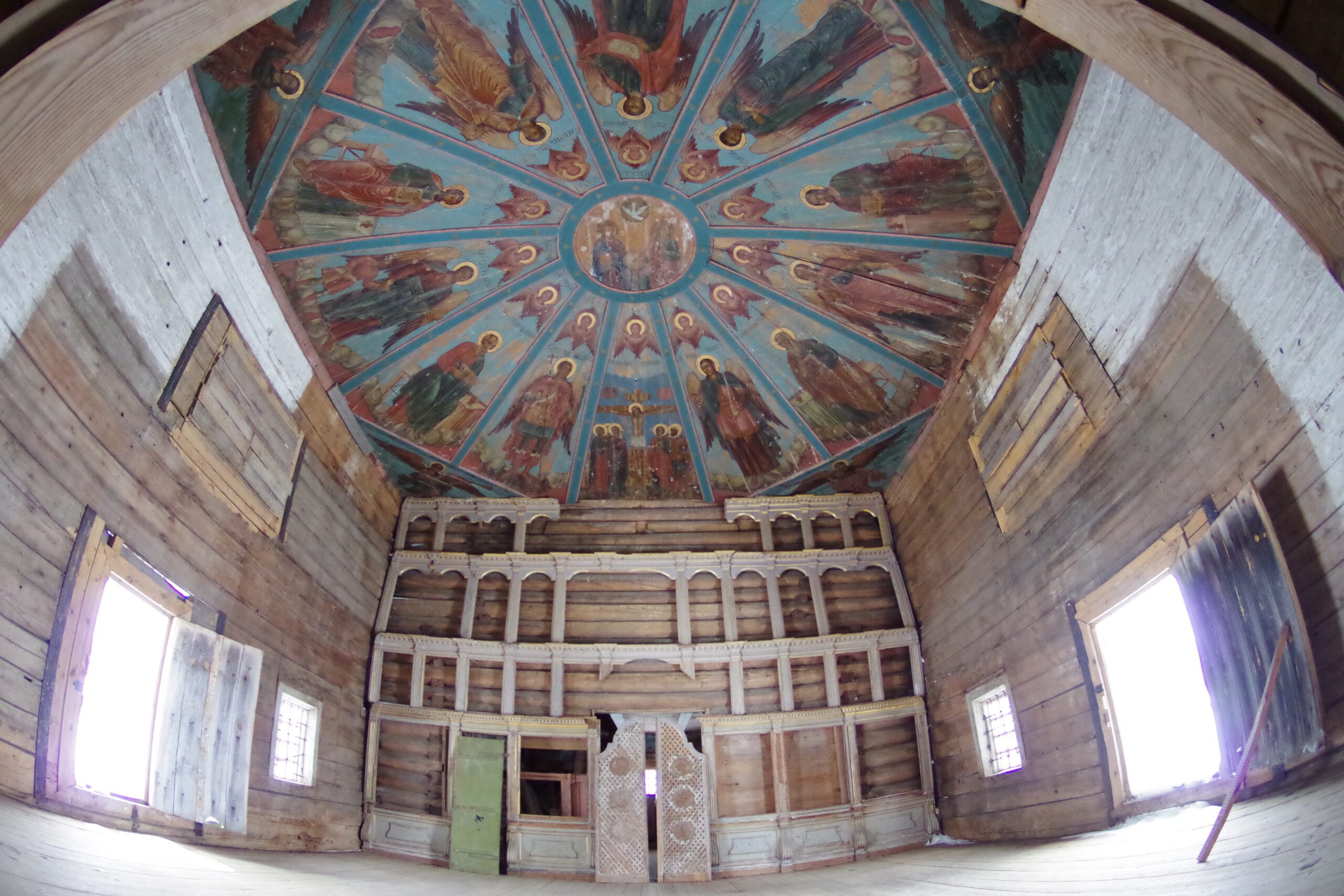 Потолок-«небо» — в интерьере четверика. Представляет собой деревянную конструкцию в виде каркаса, перекрывающую пролет без промежуточных опор. Каркас составляют наклонные деревянные тябла-балки, которые радиально расходятся от центрального опорного кольца и опираются на пристенные конструкции в основании каркаса. Конструкция удерживается исключительно за счет распора балок каркаса. Высота от пола до потолка – 5,7 м, «небо» перекрывает пролет 8 метров (по данным Т.М.Кольцовой). Тябла разделяют конструкцию «неба» на сегменты в виде 12-ти трапециевидных граней. Заполнение граней выполнены из досок, скрепленных между собой с обратной стороны шпонками. Угловые части «неба» — плоские, треугольной формы «паруса».