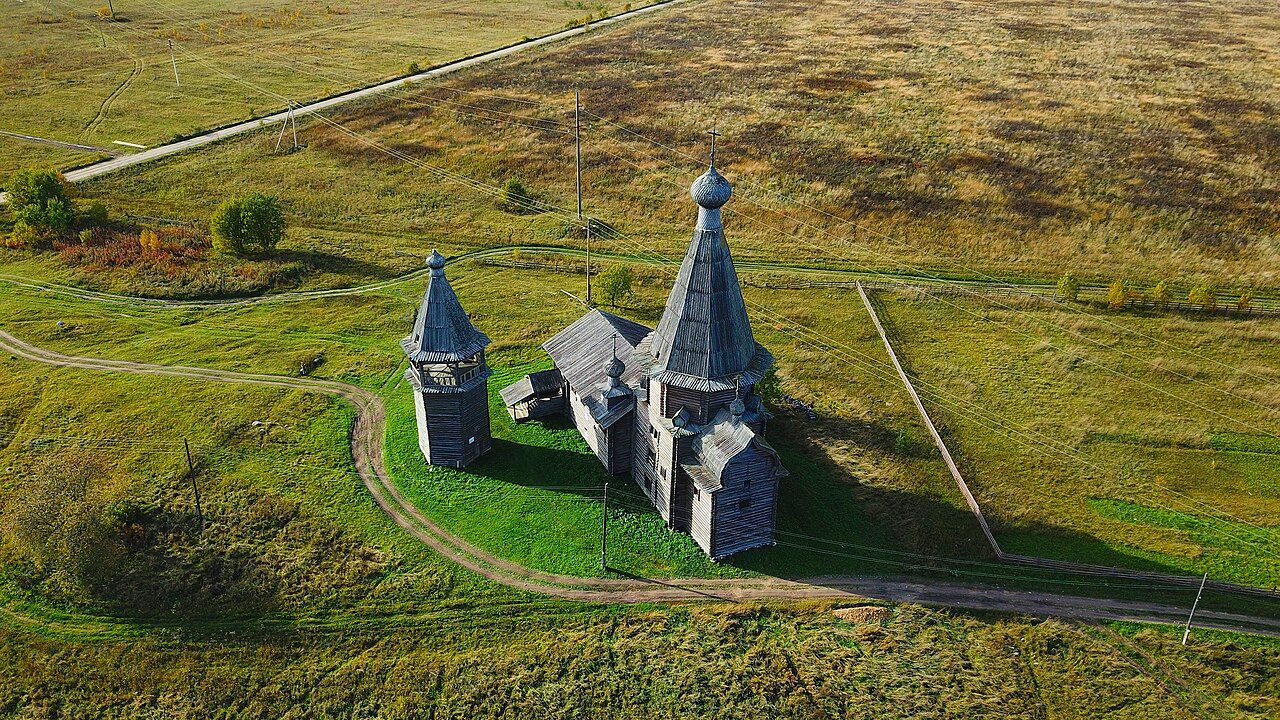 Продольно-осевая композиция церкви сложилась за несколько столетий. Первоначально церковь представляла собой традиционный тип северного храма: восьмерик на двусветном четверике и высоком подклете, окруженный галереями и крыльцами с трех сторон. Завершением восьмерика служит высокий шатер с луковичной главкой и крестом. С востока к церкви выполнен алтарный прируб в виде одной апсиды, перекрытой бочкой и увенчанной маковкой. С западной стороны к церкви позднее пристроена прямоугольная в плане одноэтажная на подклете трапезная с притвором, перекрытая двускатной крышей. В плане трапезная смещена относительно основной продольной оси храма в южную сторону. С южного фасада к трапезной примыкает крыльцо с широкой площадкой и лестничным маршем на столбах, перекрытое тесовой кровлей. Юго-восточный угол обьема трапезной на уровне кровли отмечен главкой придела на четырехгранном основании, рубленном «в лапу». Главка завершена крестом и имеет лемеховое покрытие.