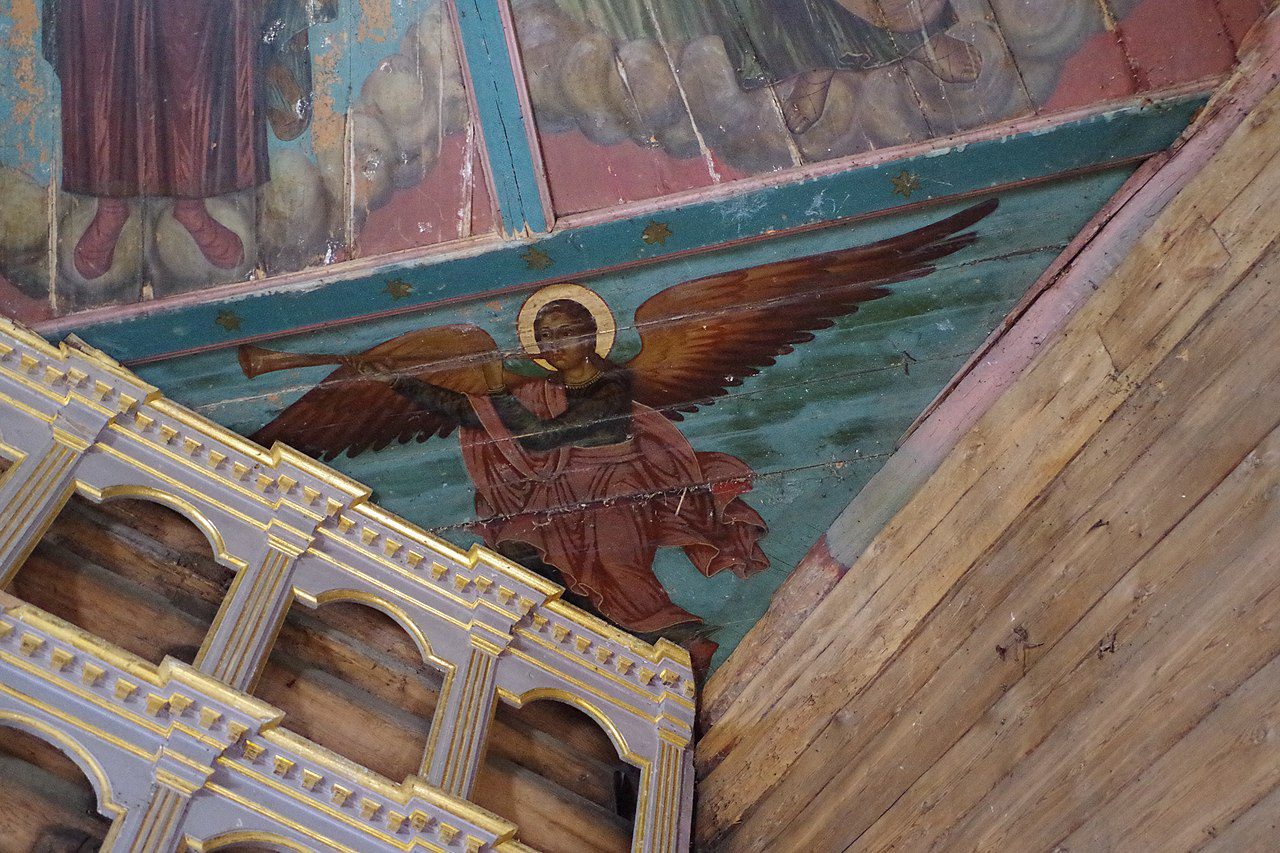 В центральном круге «небес» изображена Святая Троица. От этого изображения, написанного в круге, по сторонам «небес», помещены изображения Распятия Господа напротив царских врат, 4 евангелиста и 7 архангелов. По углам изображения трубящих ангелов. Вокруг центрального кольца, в верхней части граней «небес» помещена надпись: «Свят, свят, свят Господь Саваоф исполне небо и земля славы твоея осанна в вышних» – слова ангельского песнопения и песни евреев, встречавших Христа при его торжественном шествии в Иерусалим. Текст начинается на грани с изображением Архангела Михаила и идет вокруг центрального круга в верхней части каждой грани. Радиальные балки каркаса и центральный круг окрашены темно-синим цветом, с росписью в виде звезд. Фон граней – синий, центрального круга – охристый. В цветовой гамме использованы звучные и локальные цвета, рассчитанные на восприятие с определенного расстояния. Нимбы позолочены.