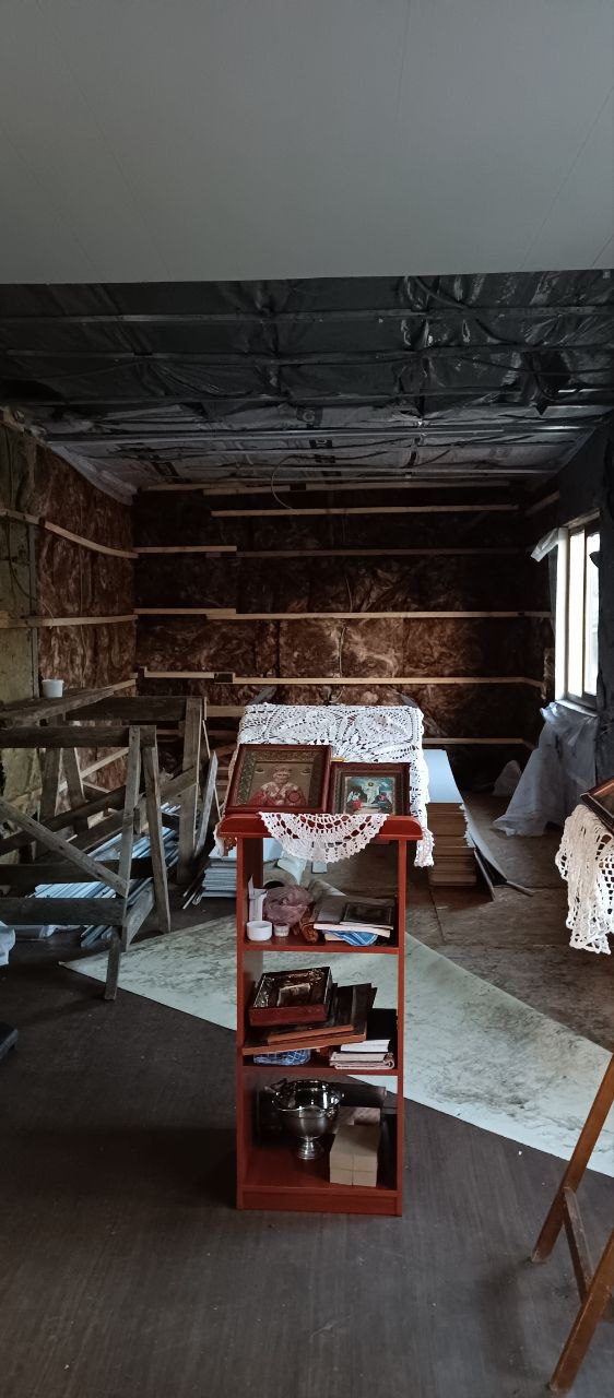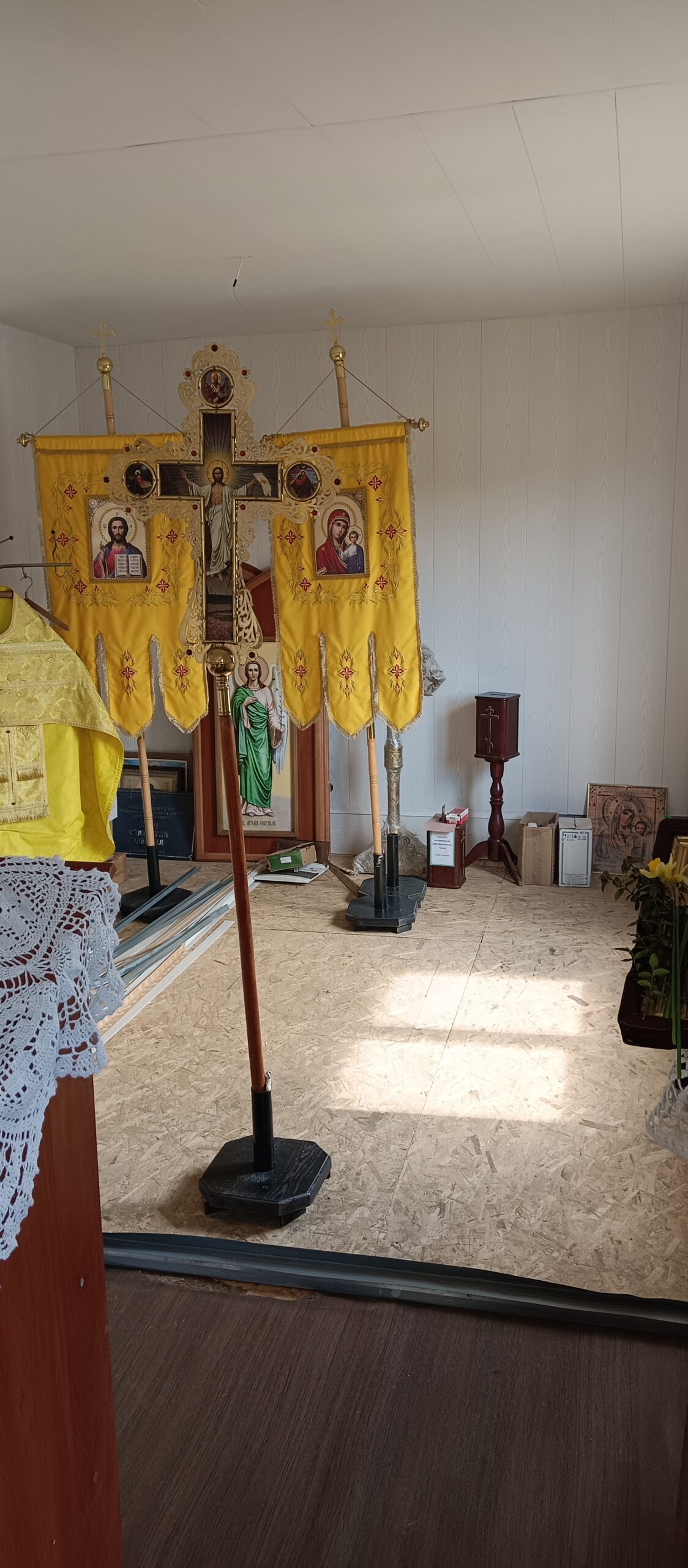 Для проведения служб, пока строится храм, был приспособлен небольшой вагончик, который был обустроен прихожанами с большой заботой, теплотой и вниманием.